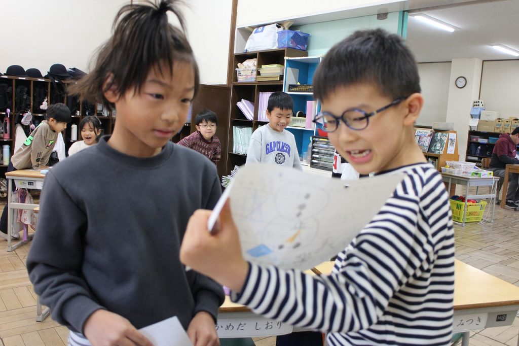 1年生と6年生、それぞれの生活の時間に、冬の思い出を交換しました。 子どもたちそれぞれ冬休みにあったことを3つ選んでエピソードを書きます。 でも、そのうちひとつはうそのエピソードです。 みんなでそれをあてっこしました。