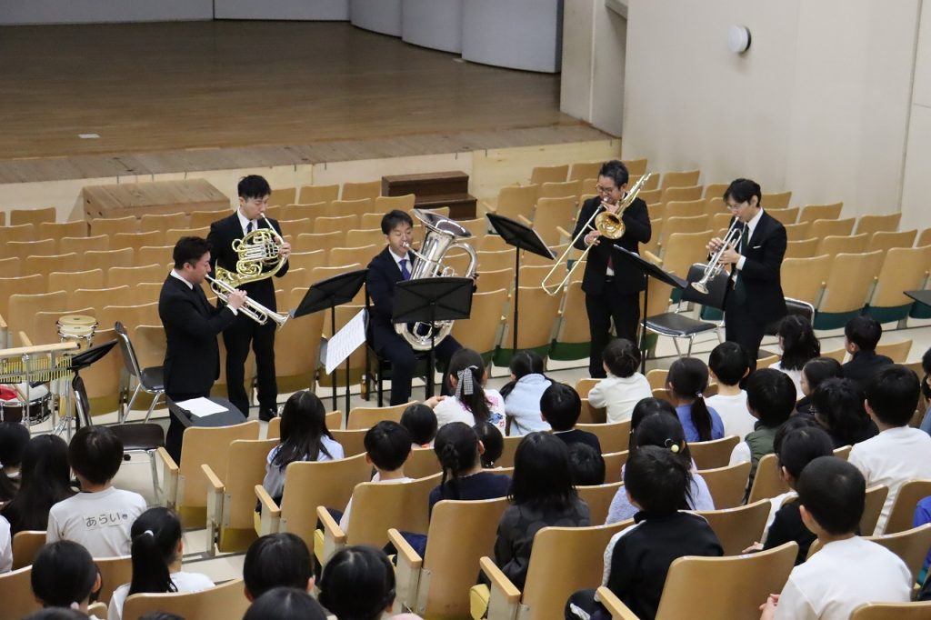 川田修一さんとその仲間たちが、この日、3・4年生のために金管五重奏を奏でてくれました。 トランペットがおふたり、それにホルンにトロンボーンにチューバにパーカッション。 それぞれの楽器がまるで自己紹介をするように音を奏でて