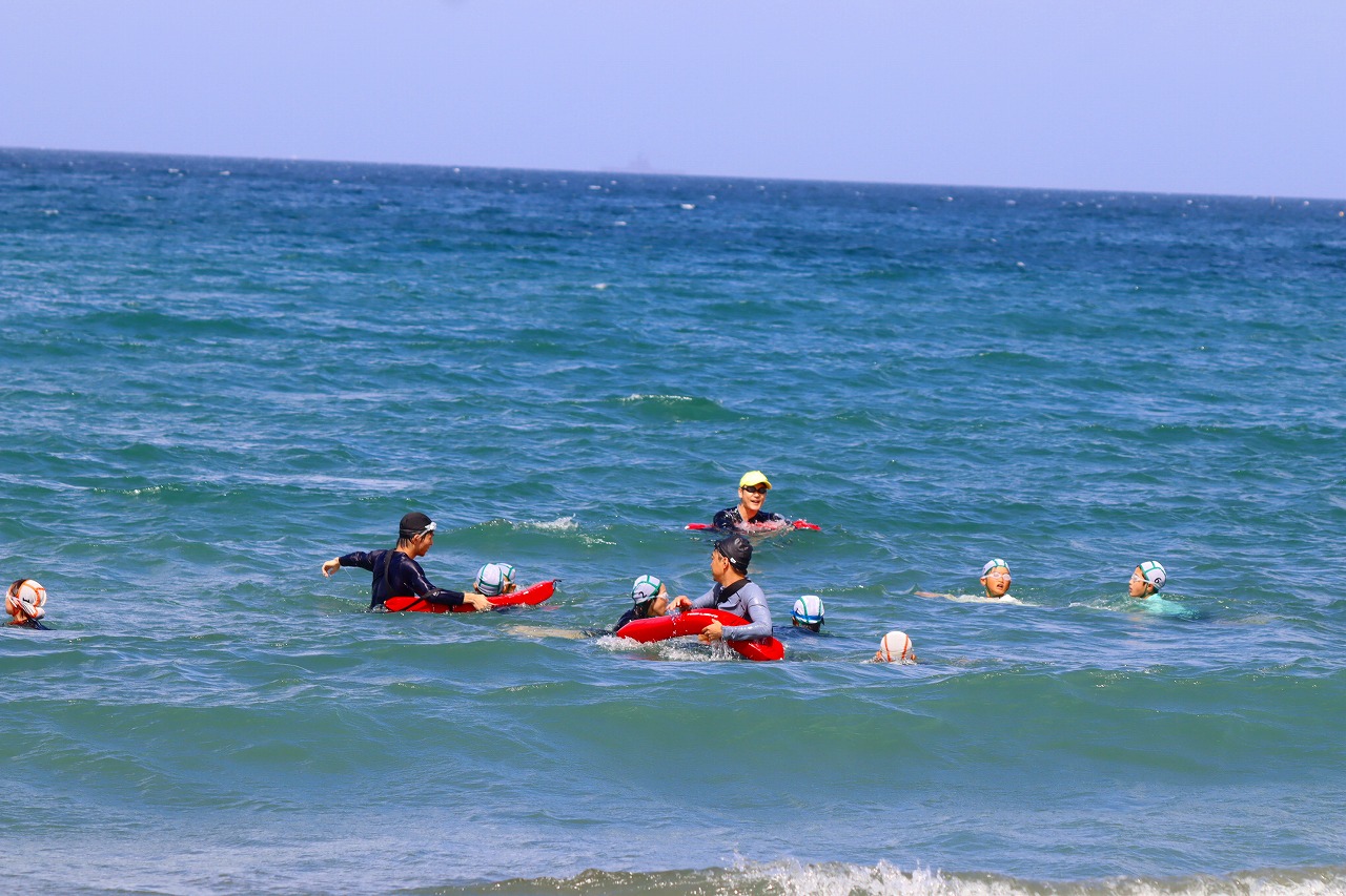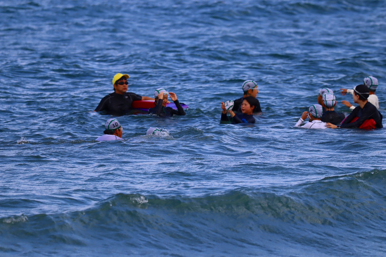 波が押し寄せるたびに、みんなの水泳帽が波にのまれて一瞬見えなくなります。