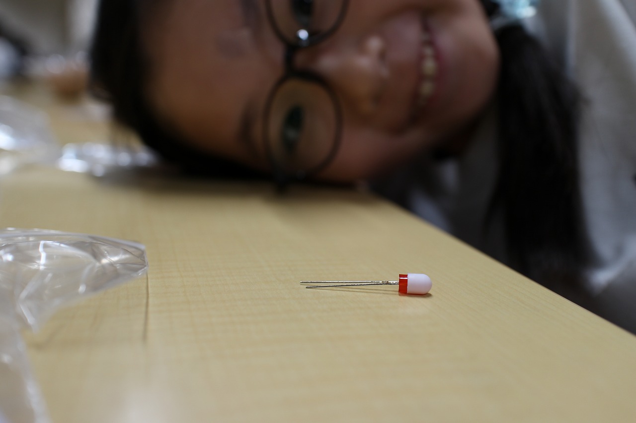 最初はコイン電池と小さなLED電球を使って光をつけました。