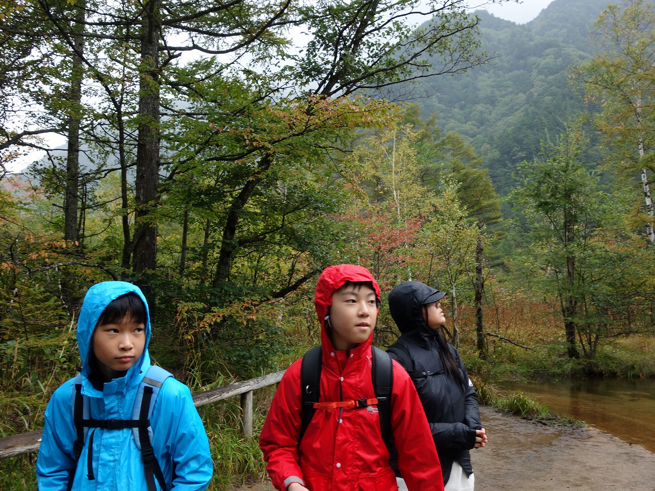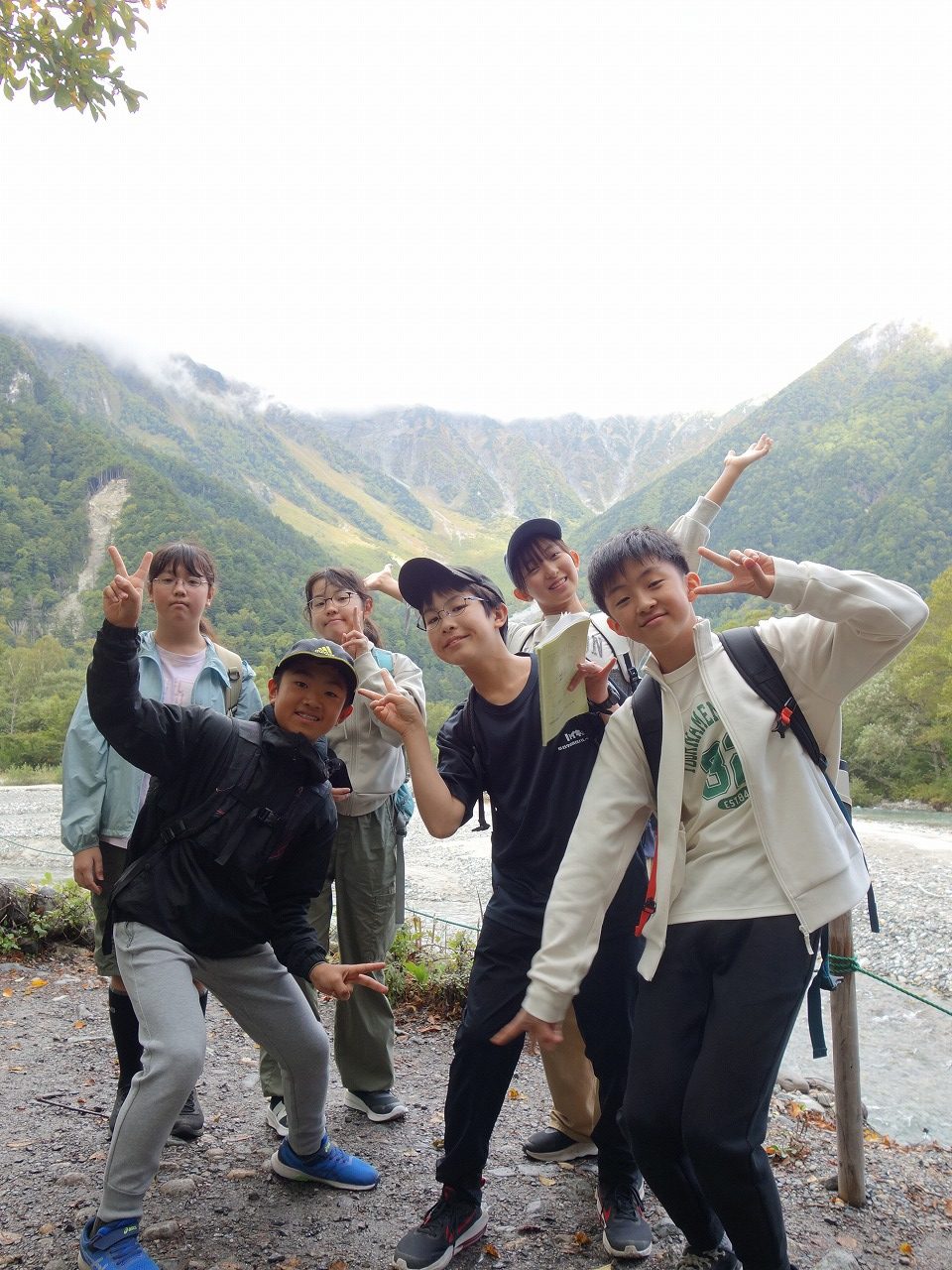 エメラルドグリーンに流れる梓川も、その先に見える穂高連邦の峰々も、子どもたちを迎えているようです。
