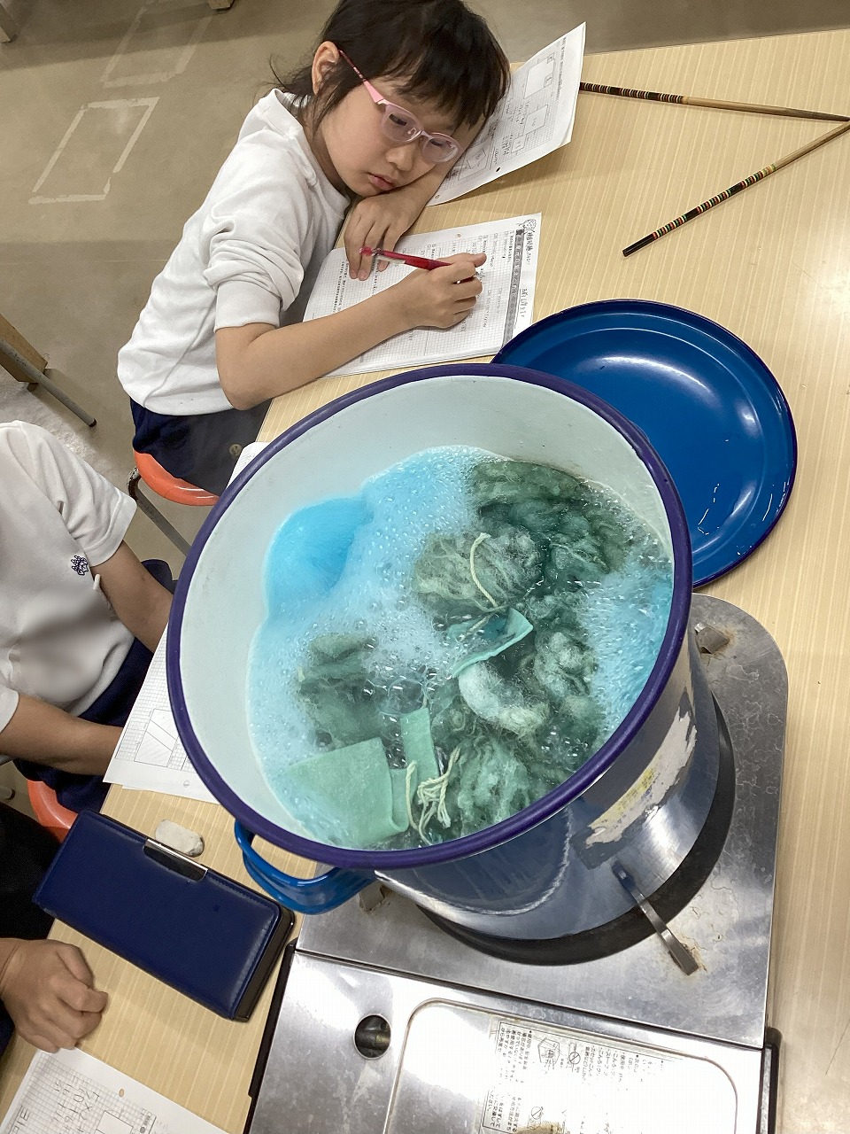 そうです。この日は4年生が草木染めで羊の毛に色をつける日なのです。