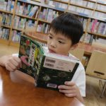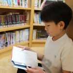 テーブルまでたどり着く間も惜しむように本棚に寄りかかって本を開いていたのは5年生。持っていた本はちょっと怖そうな表紙。