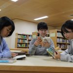 振り返ると6年生の女の子3人が頭を突き合わせてひとつのテーブルでもくもくと読書。