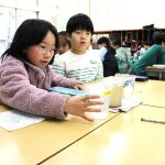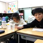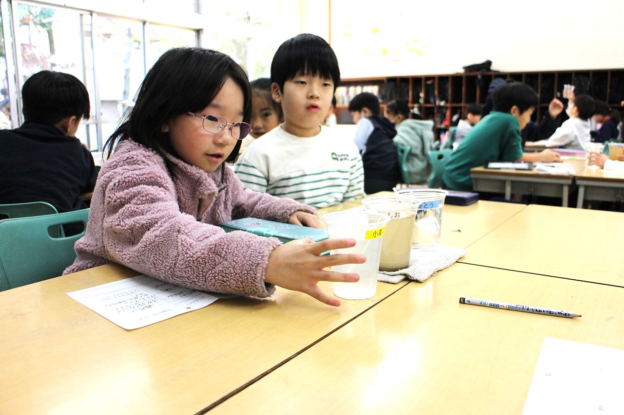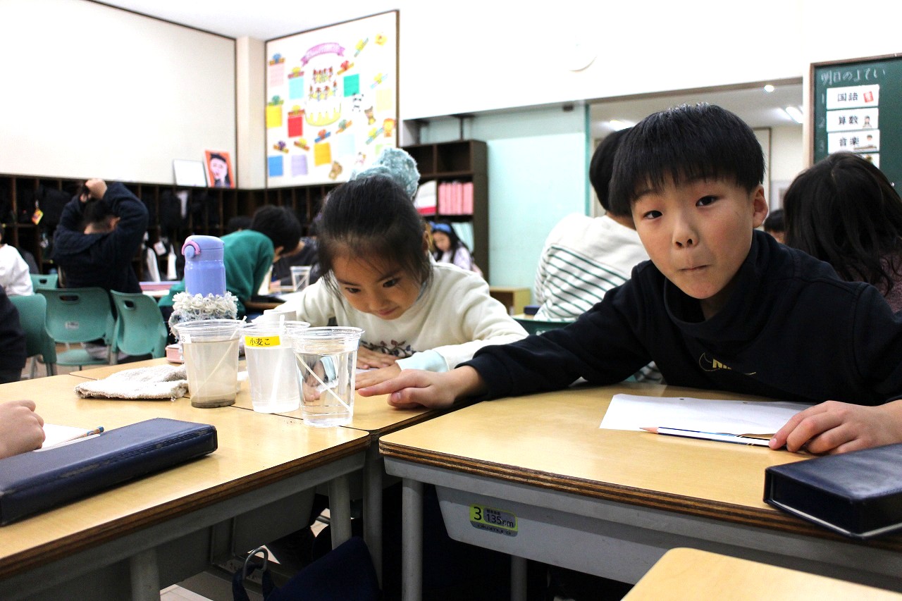 授業中の2年生の教室をのぞくと、机の上に置かれた3つのコップをじっと見つめる姿がありました。