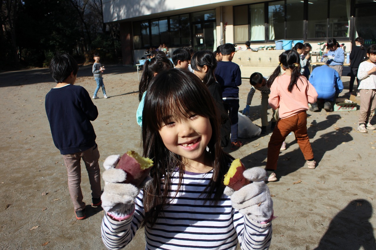 畑から白い煙がもくもくとあがっています。 2学期の終わりがすぐそこにせまったこの日は、1年生が畑で落ち葉たきをやっていました。 校内の木々から散った葉を集めて、たき火に入れていきます。 前日の雨のせいか、葉っぱからは白い
