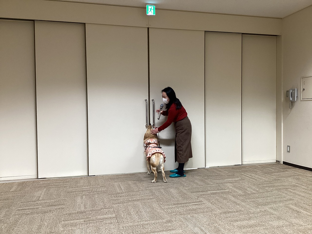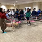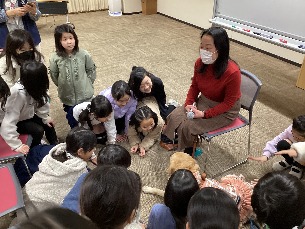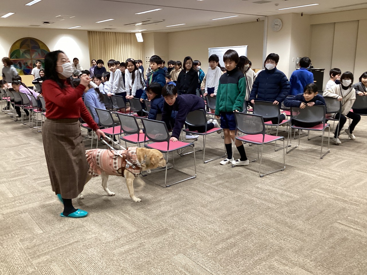 ホールの前方にゴールデンレトリバーの「コウメ」が落ち着いた様子で座っています。
