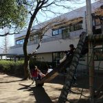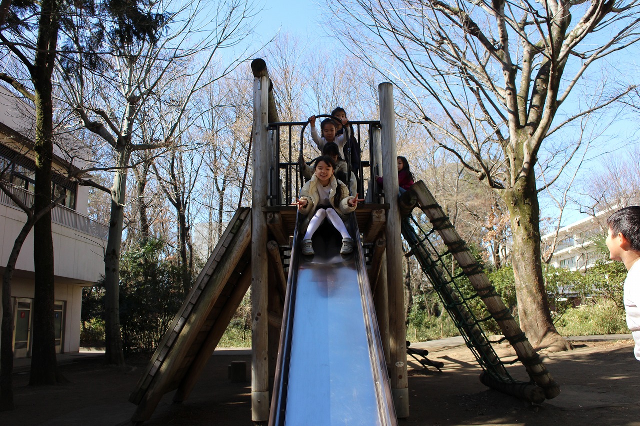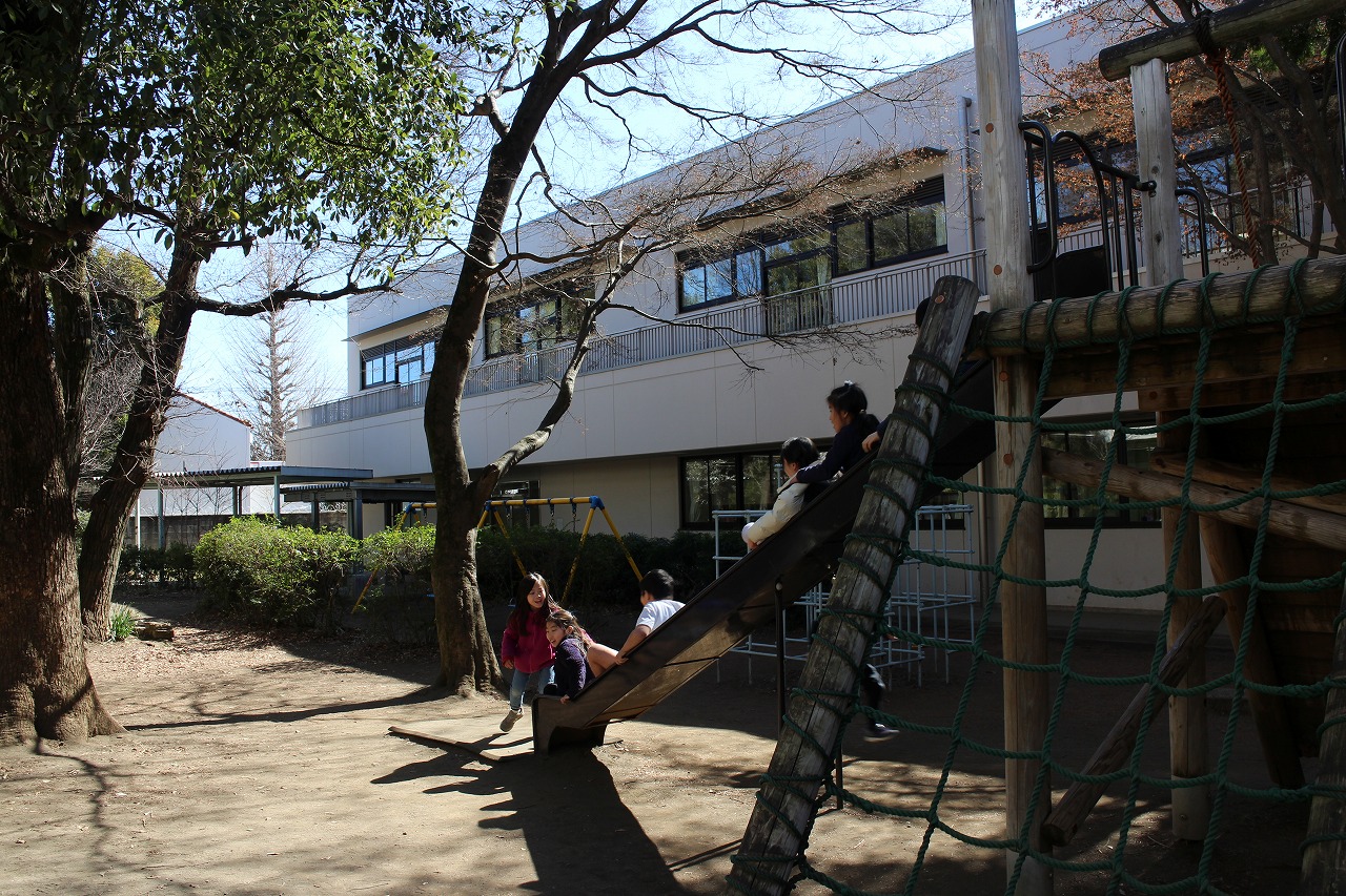 梅の花の向こう側、中庭では子どもたちの笑い声にあわせるようにシジュウカラのさえずりが響いています。